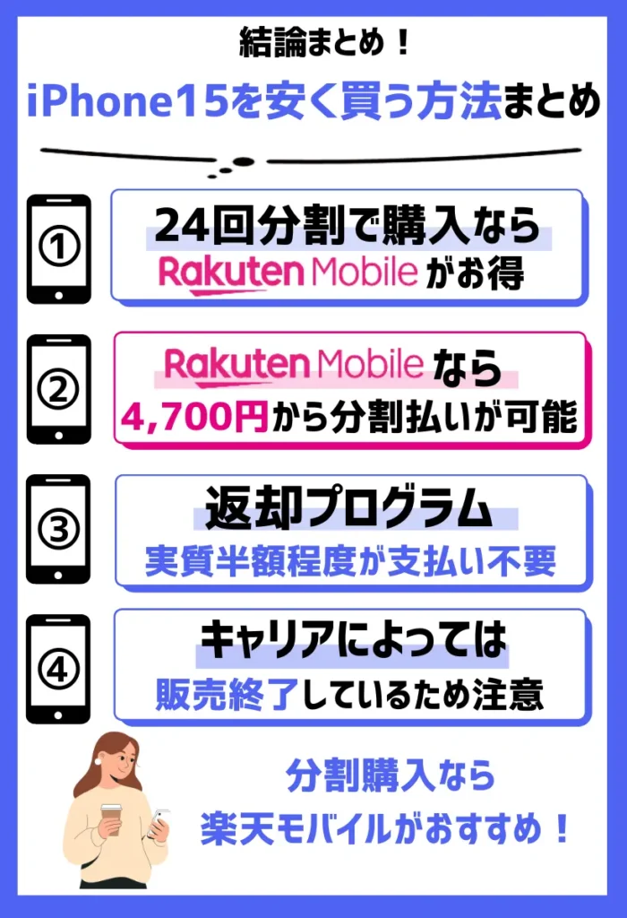 楽天モバイルでiPhone15シリーズを安く買う方法は、次の3種類があります。