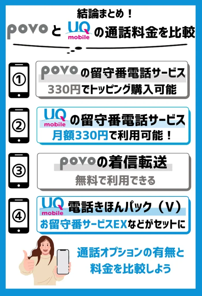 【通話料金を比較】povoはかけ放題が安く、UQモバイルは通話オプションが豊富でお得
